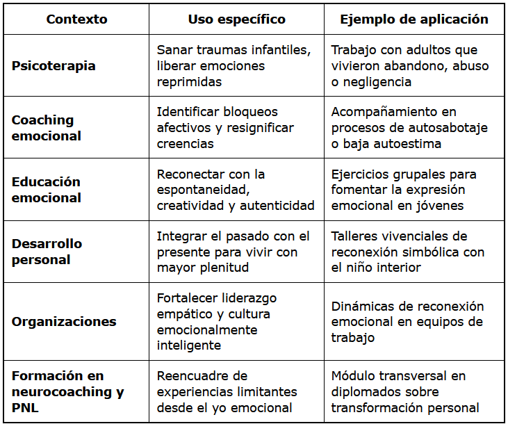C. USO: El uso principal de la técnica del niño interior es facilitar procesos de sanación emocional, resignificación de experiencias infantiles y transformación de patrones inconscientes que afectan la vida adulta. Esta técnica se aplica en contextos terapéuticos, educativos, organizacionales y de desarrollo personal, y su versatilidad permite adaptarla según el nivel de profundidad emocional y el perfil del participante.